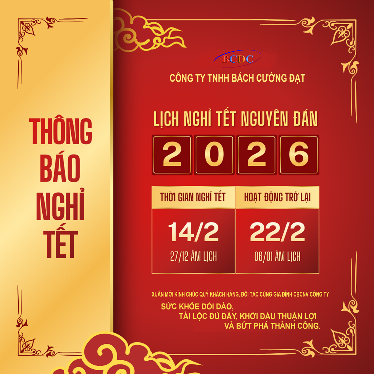 Công ty TNHH Bách Cường Đạt (BCDC) trân trọng thông báo đến Quý khách hàng lịch nghỉ Lễ Tết Nguyên Đán năm 2026 như sau: